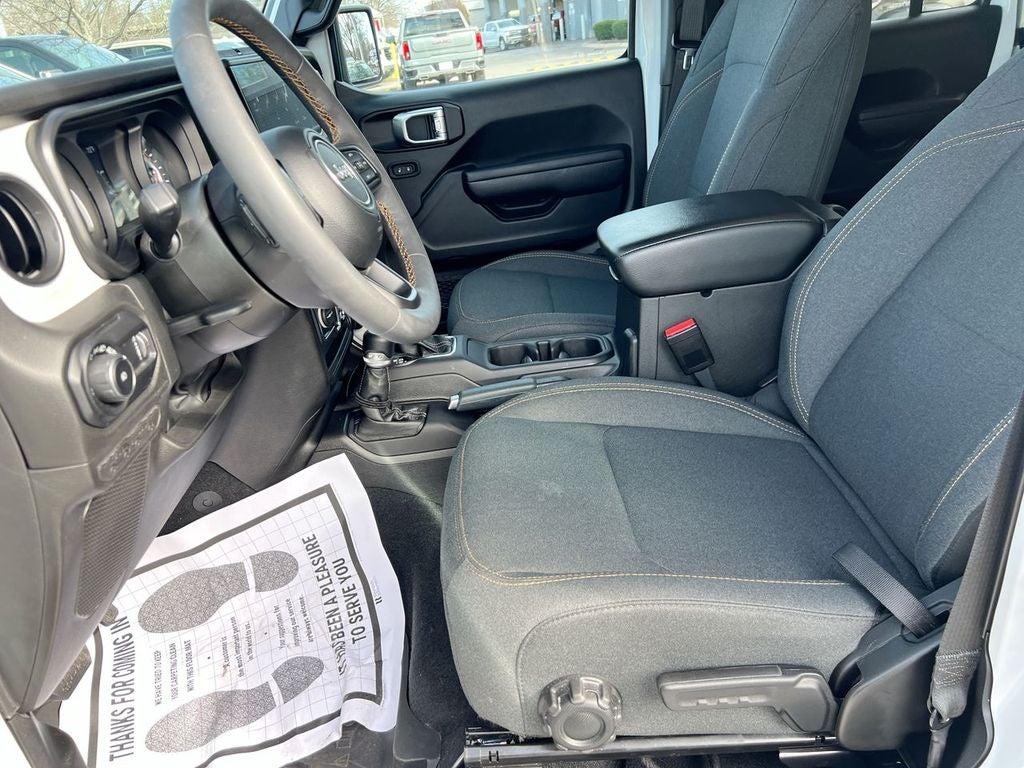 Convenience Group: Emergency/assistance Call; 2-Door Passive Entry. Front Door Locks; Remote Start System; Cluster 7.0"" TFT Color Display; Universal Garage Door Opener; Heated Front Seats; Air Conditioning with Auto Temp Control; Heated Steering Wheel; Air Filtering. Quick Order Package 22S Sport S: Advanced Brake Assist; Speed Sensitive Power Locks; Automatic Headlamps; Deep Tint Sunscreen Windows; Full Speed Forward Collision Warning Plus; Front 1-Touch Down Power Windows; Sport S; 17"" X 7.5"" Gray Wheels; Power Heated Mirrors; Enhanced Adaptive Cruise Control; Corning Gorilla Glass; Premium Wrapped Steering Wheel; Security Alarm; Sun Visors with Illuminated Vanity Mirrors; Remote Keyless Entry. LED Headlamp and Fog Lamp Group: Front LED Fog Lamps; LED Premium Reflector Headlamps. Quick Order Package 23S Sport S: Advanced Brake Assist; Speed Sensitive Power Locks; Automatic Headlamps; Deep Tint Sunscreen Windows; Full Speed Forward Collision Warning Plus; Front 1-Touch Down Power Windows; Sport S; 17"" X 7.5"" Gray Wheels; Power Heated Mirrors; Enhanced Adaptive Cruise Control; Corning Gorilla Glass; Premium Wrapped Steering Wheel; Security Alarm; Sun Visors with Illuminated Vanity Mirrors; Remote Keyless Entry. Sky 1-Touch Power Top. Jeep Trail Rated Kit. MOPAR All-Weather Floor Mats. **Equipment listed is based on original vehicle build and subject to change. Please confirm the accuracy of the included equipment by calling the dealer prior to purchase.**