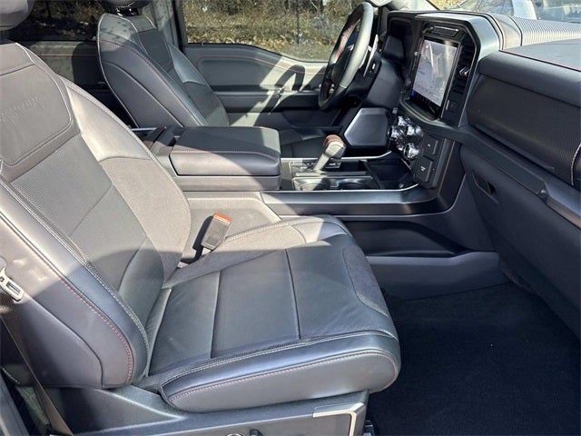THIS VEHICLE INCLUDES THE FOLLOWING FEATURES AND OPTIONS: Equipment Group 801A Standard, F-150 Raptor, Ford Blue Advantage: Blue Certified Certified, 4D SuperCrew, 3.5L V6 EcoBoost, 10-Speed Automatic, 4WD, Agate Black Metallic, Black Leather, Navigation system: Connected Navigation, 14 Speakers, 17 Cast Aluminum Wheels, 4-Wheel Disc Brakes, ABS brakes, Adjustable pedals, Air Conditioning, Alloy wheels, AM/FM radio: SiriusXM with 360L, Auto High-beam Headlights, Auto tilt-away steering wheel, Auto-dimming door mirrors, Auto-dimming Rear-View mirror, Automatic temperature control, Brake assist, Bumpers: body-color, Compass, Delay-off headlights, Driver door bin, Driver vanity mirror, Dual front impact airbags, Dual front side impact airbags, Electronic Locking w/4.10 Axle Ratio, Electronic Stability Control, Emergency communication system: SYNC 4 911 Assist, Front anti-roll bar, Front Bucket Seats, Front Center Armrest, Front dual zone A/C, Front fog lights, Front reading lights, Front wheel independent suspension, Fully automatic headlights, Garage door transmitter, Heads-Up Display, Heated door mirrors, Heated front seats, Heated rear seats, Heated steering wheel, Illuminated entry, Internet access capable: FordPass Connect 5G, Lane Departure Warning System, Leather steering wheel, Leather Trimmed Seats, Low tire pressure warning, Memory seat, Occupant sensing airbag, Outside temperature display, Overhead airbag, Overhead console, Panic alarm, Passenger door bin, Passenger vanity mirror, Pedal memory, Power door mirrors, Power driver seat, Power passenger seat, Power steering, Power windows, Radio data system, Radio: B&O Unleashed Sound System by Bang & Olufsen, Rain sensing wipers, Rear reading lights, Rear step bumper, Rear window defroster, Remote keyless entry, Security system, Speed control, Speed-sensing steering, Split folding rear seat, Steering wheel memory, Steering wheel mounted audio controls, SYNC 4 w/Enhanced Voice Recognition, Tachometer, Telescoping steering wheel, Tilt steering wheel, Tough Bed Spray-In Bedliner, Traction control, Trip computer, Turn signal indicator mirrors, Twin Panel Moonroof, Variably intermittent wipers, and Ventilated front seats.