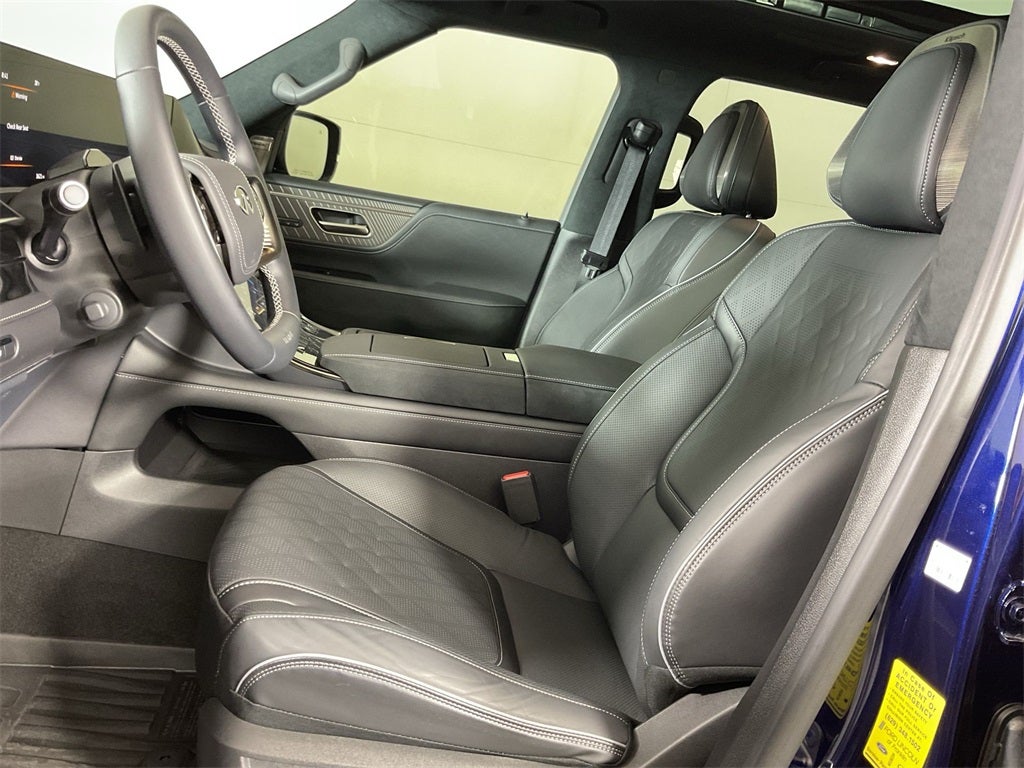The Optional Features Included on this are: Premium Cargo Package (Cargo Blocks/Stabilizers, Cargo Shelf/Barrier, Carpeted Cargo Area Protector, Console Net, and Soft-Sided Cargo Cooler), 3rd row seats: bench, 4-Wheel Disc Brakes, ABS brakes, Adaptive suspension, Air Conditioning, Alloy wheels, AM/FM radio: SiriusXM with 360L, Anti-whiplash front head restraints, Apple CarPlay/Android Auto, Audio memory, Auto High-beam Headlights, Auto tilt-away steering wheel, Auto-dimming door mirrors, Auto-dimming Rear-View mirror, Auto-leveling suspension, Automatic temperature control, Brake assist, Bumpers: body-color, Compass, Delay-off headlights, Driver door bin, Driver vanity mirror, Dual front impact airbags, Dual front side impact airbags, Electronic Stability Control, Emergency communication system: INFINITI InTouch, Four wheel independent suspension, Front anti-roll bar, Front Bucket Seats, Front Center Armrest, Front dual zone A/C, Front reading lights, Fully automatic headlights, Garage door transmitter: myQ Connected Garage, Genuine wood dashboard insert, Genuine wood door panel insert, Heads-Up Display, Heated and Climate Controlled Front Bucket Seats with Massage, Heated door mirrors, Heated front seats, Heated rear seats, Heated steering wheel, HVAC memory, Illuminated entry, Knee airbag, Leather steering wheel, Low tire pressure warning, Memory seat, Navigation system: Google Built-in, Occupant sensing airbag, Outside temperature display, Overhead airbag, Overhead console, Panic alarm, Passenger door bin, Passenger vanity mirror, Power door mirrors, Power driver seat, Power Liftgate, Power moonroof, Power passenger seat, Power steering, Power windows, Radio data system, Radio: Klipsch Premiere Audio System, Rain sensing wipers, Rear air conditioning, Rear anti-roll bar, Rear reading lights, Rear seat center armrest, Rear window defroster, Rear window wiper, Reclining 3rd row seat, Remote keyless entry, Security system, Semi-Aniline Premium Leather Seating Surfaces, Speed control, Speed-sensing steering, Splash Guards, Split folding rear seat, Spoiler, Steering wheel memory, Steering wheel mounted audio controls, Tachometer, Telescoping steering wheel, Tilt steering wheel, Traction control, Trip computer, Turn signal indicator mirrors, Two-Tone Premium Paint, USB Charging Cable Set, Variably intermittent wipers, Ventilated front seats, Ventilated rear seats, and Wheels: 22 x 8.5J Cast Aluminum-Alloy.
